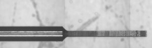 この微細超硬ピンは、軸部はΦ0.3mmになっており、先端部は厚み0.04mm・長さ1.5mmとなっております。この微細超硬ピンを製作するために、まずΦ0.3mm×20mmの超硬ピンを円筒研削加工機を用いて高精度に仕上げたのち、微細ワイヤーカット放電加工機を用いて厚み0.04mmの先端部を超精密に加工しました。