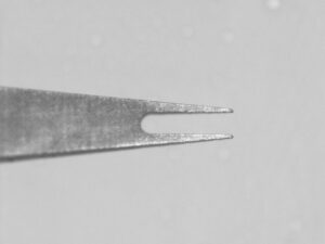 この突き上げピンの製作にあたっては、まず超硬の丸棒を円筒研削加工機にてΦ0.8に仕上げ、先端部が細くなるように研磨でテーパー形状に加工を施したのち、ワイヤー放電により二股形状に加工しております。